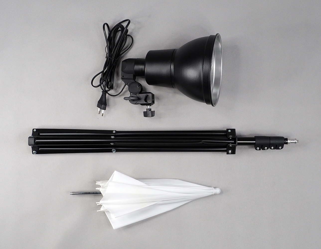Комплект состоит из плафона-рефлектора со штативной головкой, стойки и зона на просвет, позволяющего получить "мягкий" свет от лампы.
