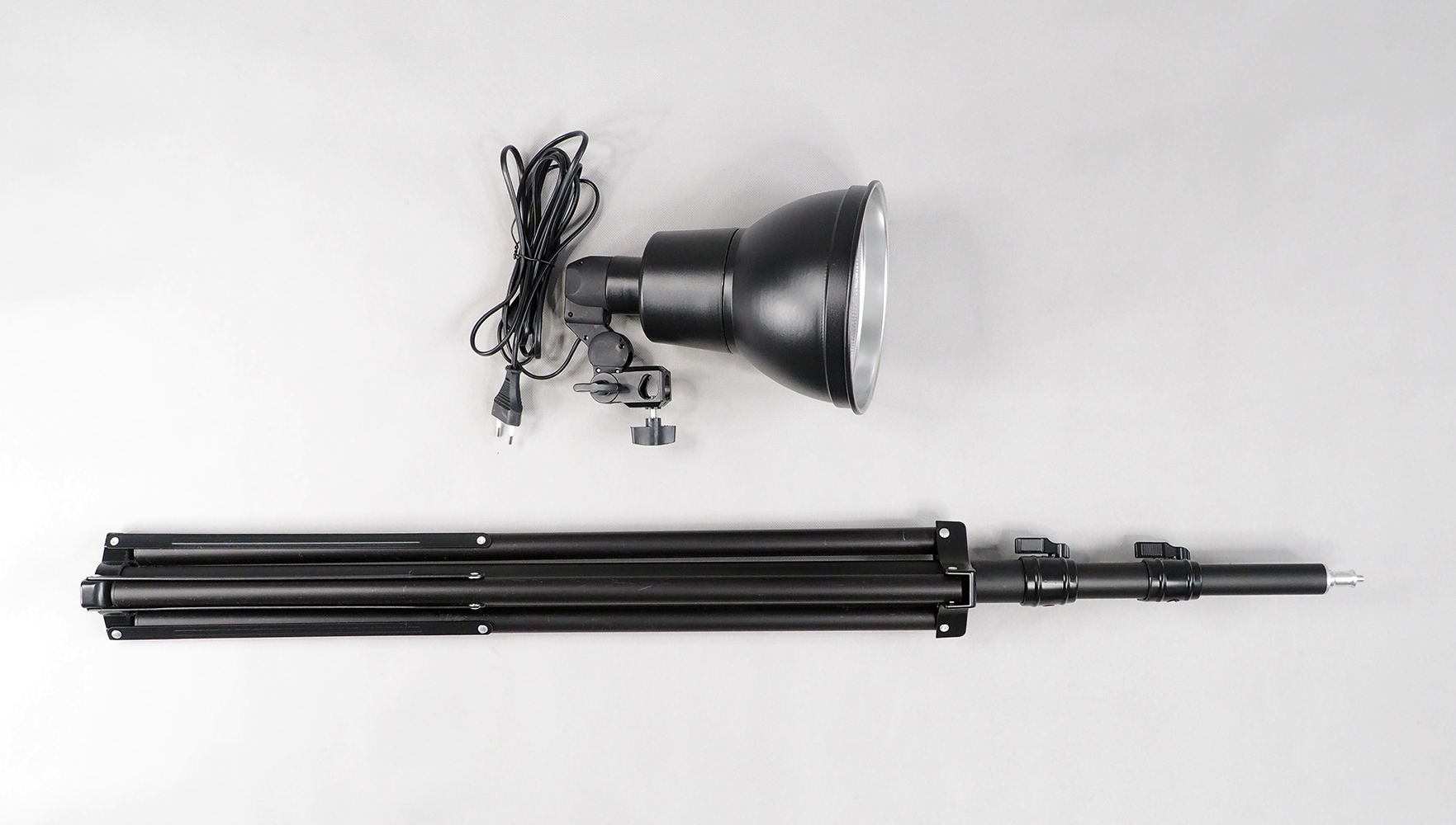Комплект состоит из плафона-рефлектора со штативной головкой и устойчивой телескопической стойки с максимальной высотой 2,6 м. Т.к. стойка тяжелая, то комплект можно использовать с любым фотозонтом (покупается отдельно), см. артикул G5006-10766.